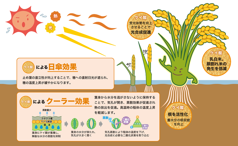 高温障害対策 近年の気象環境は高温で乾燥が強い傾向にあり、水稲は体力や水分が無くなって夏バテ状態になりがちです。高温障害は品質や収量に大きな影響を与え、登熟不足による収量低下や品質の低下(白未熟粒・胴割れ米の発生)を引き起こします。 ケイ酸を補給して、高温や乾燥に強い稲づくりが重要です。