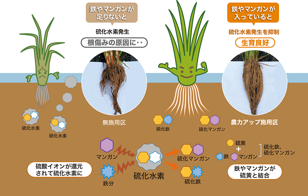 根腐れ・秋落ち対策 還元状態(酸素が少ない状態)の田んぼでは、土壌中で硫化水素が発生し、水稲の根腐れや秋落ちを引き起こします。 農力アップに含まれる鉄・マンガンは、硫化水素を水稲にとって無害な形に変えるため根腐れや秋落ちの被害を軽減します。